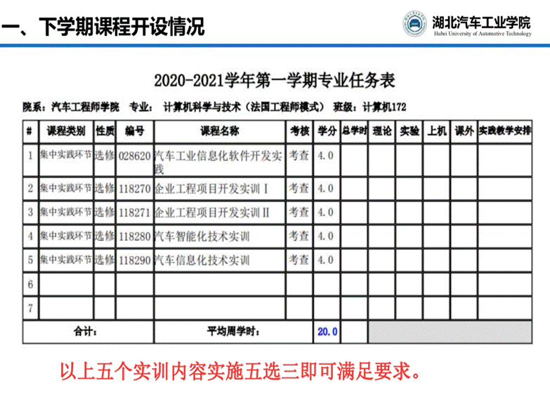 首先,杨亚会书记就下学期教学计划及安排部署工作做了说明。大四上学期实训共有五个,周期有四周及八周两种,均为4个学分。两个企业工程项目开发实训、汽车智能化技术实训、汽车信息化技术实训及汽车信息化软件开发实训。每名同学需要在这五个实训中找出三个并参与,通过完成相应的任务并撰写报告、成果验收等环节获得相应的学分。