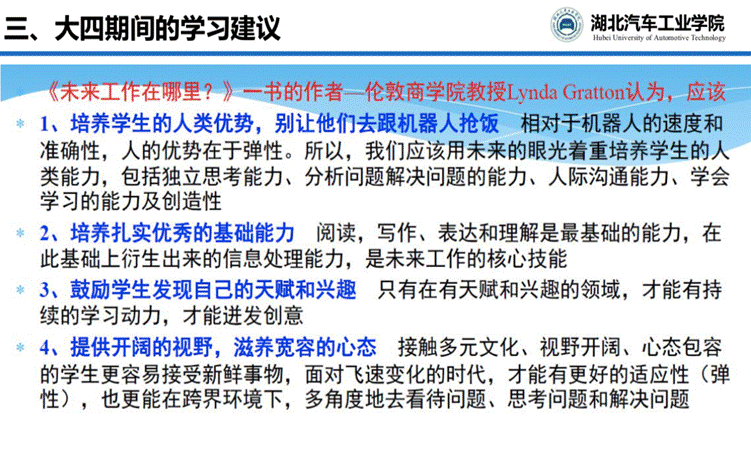 此外,杨书记鼓励同学们在学习和工作中找到自己的兴趣所在,培养各方面的能力。发现天赋、找到兴趣,才能获得持续的学习动力,才能迸发创意;培养扎实优秀的基础能力,包括阅读、写作、表达和理解这些基础能力及其衍生出来的信息处理能力,这些能力是未来工作的核心技能;培养人类优势,相对于机器人的速度和准确性,人的优势在于弹性。这其中包括独立思考的能力、分析问题的解决能力、人际沟通能力、自学能力及创造性。