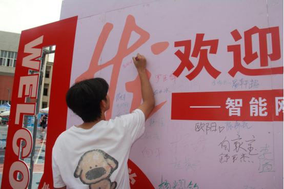 在报到点附近,公司精心布置了以文化为主题的新生签名墙。新生们纷纷驻足,用签名、班级信息或对未来的寄语,留下自己在公司的第一个“专属印记”。