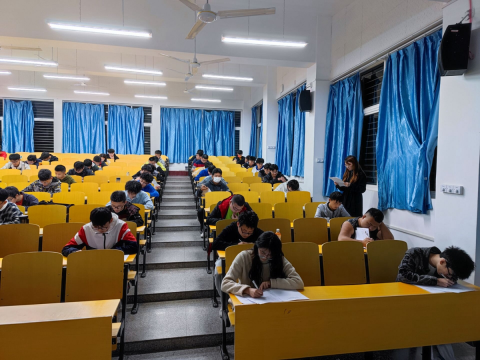 本次模拟考试,题目与英语四级题型一致,分为听力、作文、选词填空、阅读理解、翻译等五部分,考试时间安排、答题卡的回收和正式考试一致。考试之前,要求全体参加考试的同学严格按照四级考试要求,提前15分钟进入考场,按照考场名单在指定位置落座。考试过程中,同学们认真答题,沉着思考,严格遵守考试纪律。