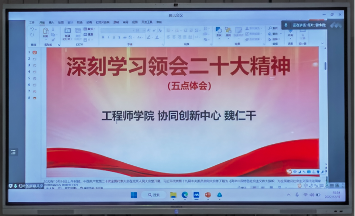 12月19日下午,汽车工程师公司党支部12月党课活动在三楼会议室顺利进行,协同创新中心常务副主任魏仁干教授以《深刻学习领会二十大精神》为题讲授了一次党课,支部全体党员以线上线下结合的方式聆听了报告。