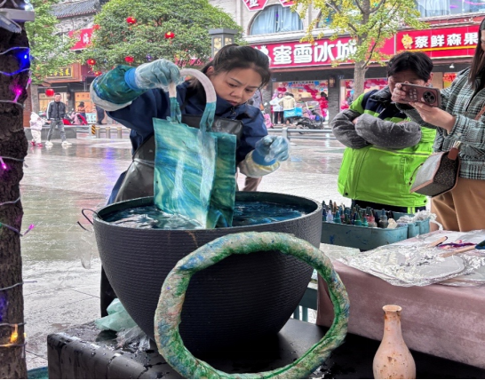 活动现场设在武当山特区的玉虚街、金街与银街,一个彩色的非遗文创市集生动呈现。集市汇聚了来自十堰地区的65种绝活技艺,内容包罗万象,从精妙的非遗技艺展示、地道的非遗美食,到创意十足的文创手作和绿色饮品,营造出吃非遗、玩非遗、晒非遗的浓厚氛围。员工们流连于各个摊位,不仅用眼睛欣赏武当宫灯、传统刺绣等工艺品的精湛,更用味蕾体验着地方特色美食的独特风味。