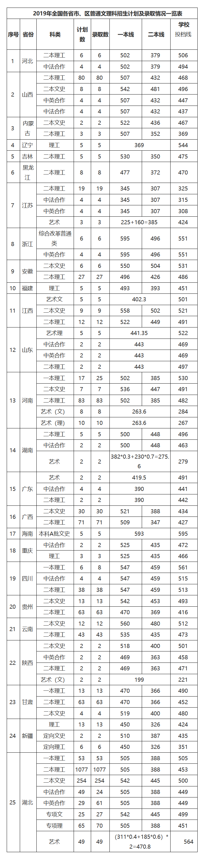 2019年全国各省市、区普通文理科招生计划及录取情况一览表