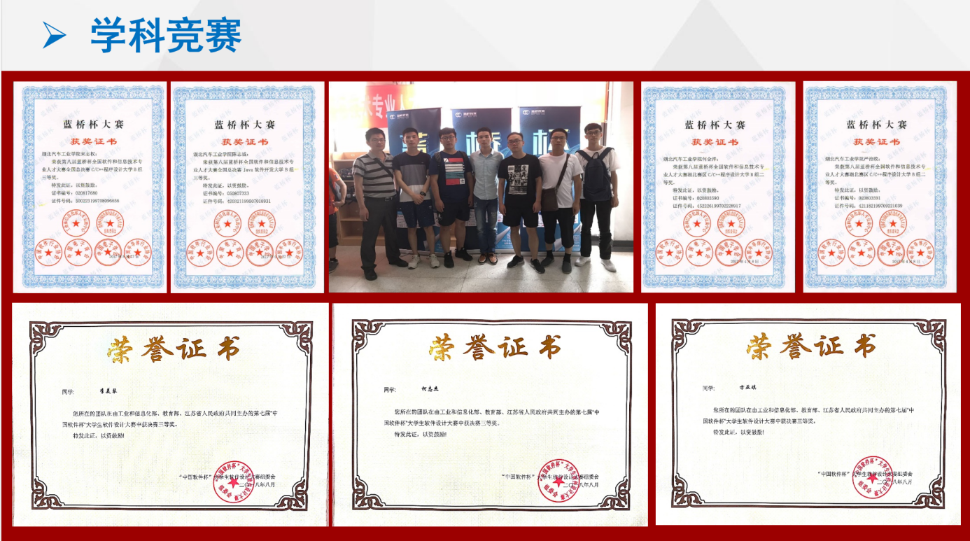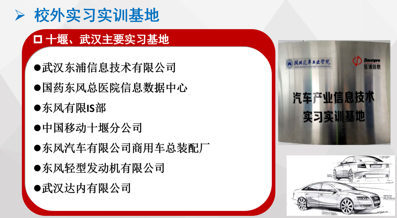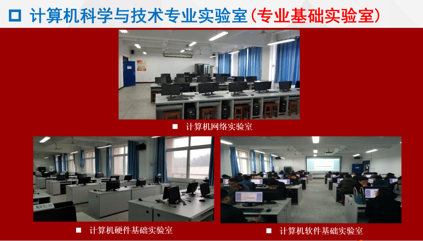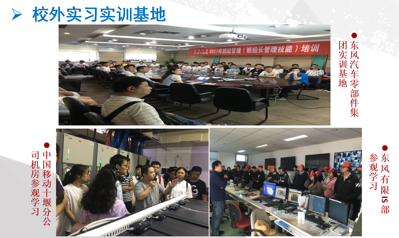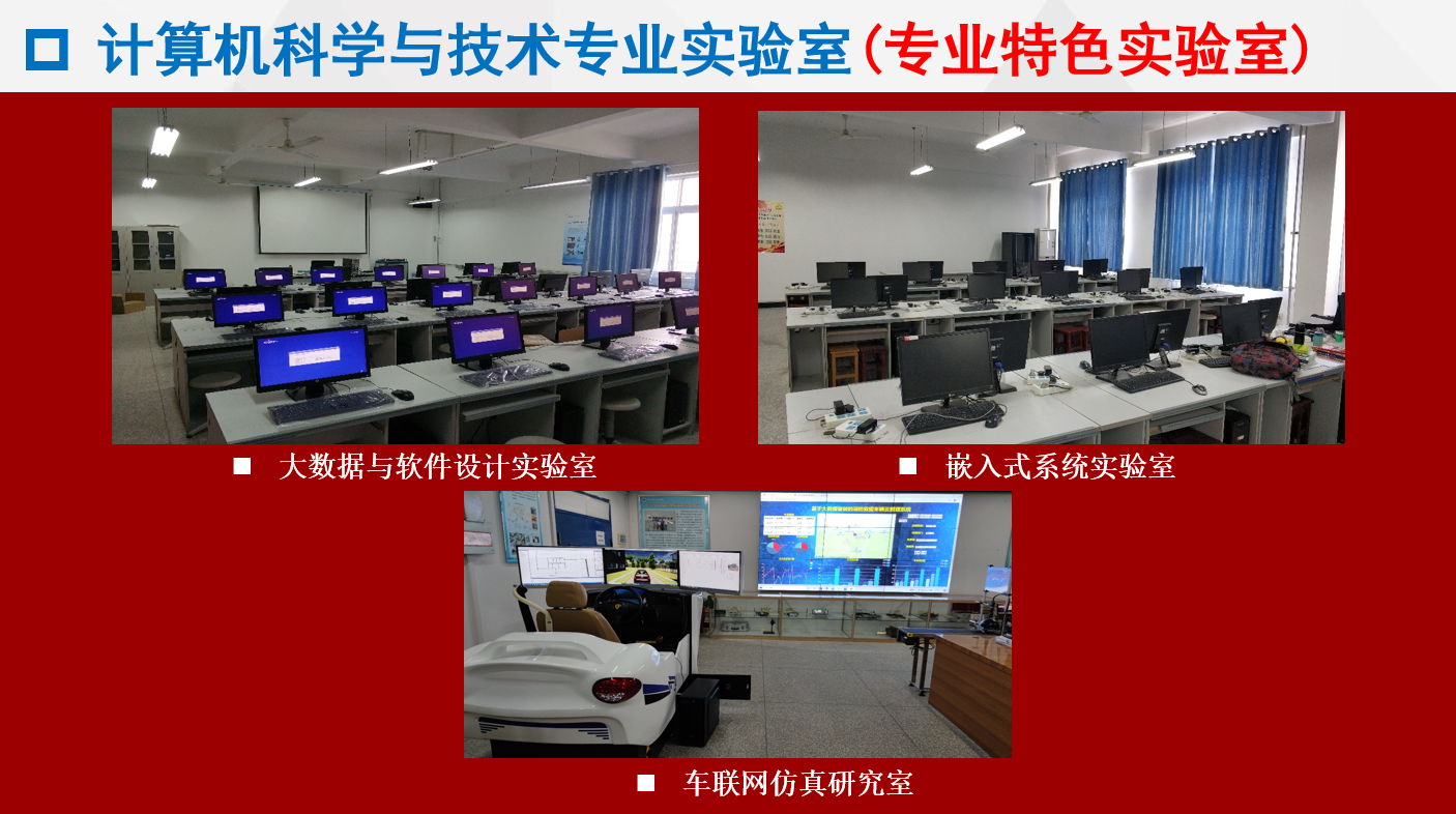 本专业配备有“汽车产业信息技术”省级实习实训基地和计算机实践教学与电工电子实践教学2个省级实验教学示范中心,另设嵌入式系统、计算机网络工程、大数据与软件设计、计算机软件基础、计算机硬件基础 5 个专业实验室和10余个校企合作基地。