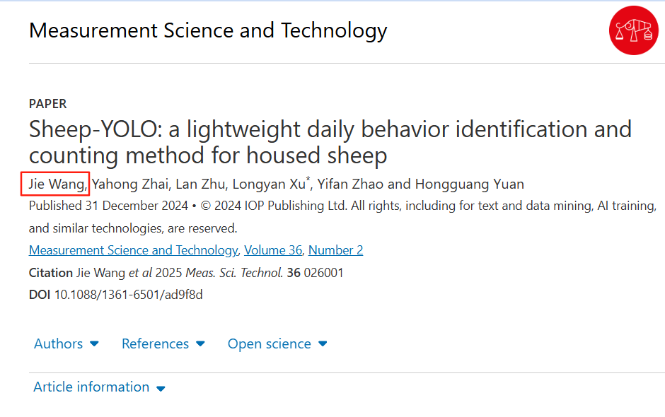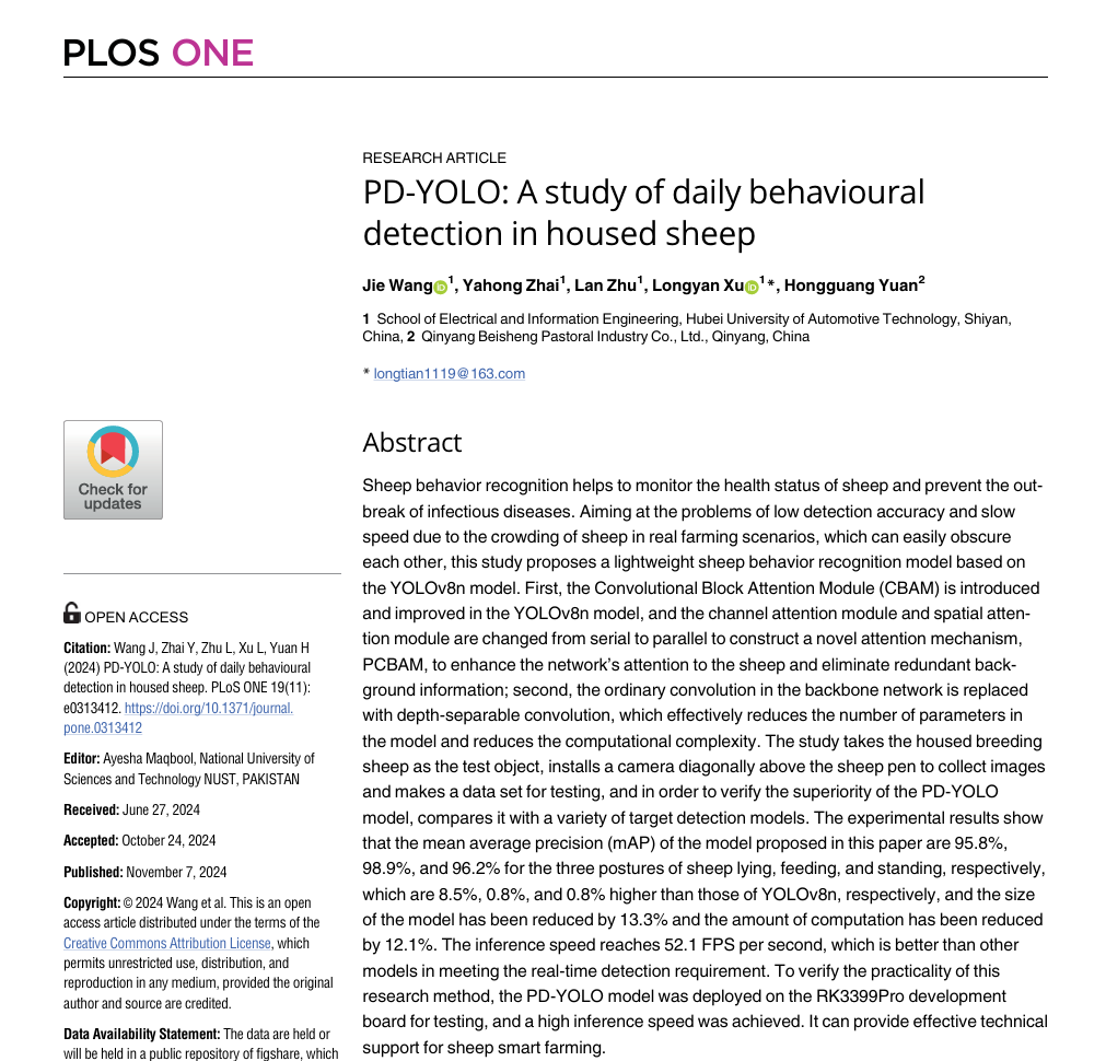 进入研二下半学年,通过阅读文献不断优化实验条件,与此同时,我的导师常常鼓励和帮助我,最终成功获得较好的成果。在2024年8月以第一作者身份在《红外技术》期刊上发表了题为“轻量级夜间红外图像舍养绵羊行为识别方法”的文章;在2024年11月以第一作者身份在PLOS ONE期刊上发表了题为“PD-YOLO: A study of daily behavioural detection in housed sheep”的文章;在2024年12月以第一作者身份在Measurement science and technology期刊上发表了题为“Sheep-YOLO: a lightweight daily behavior identification and counting method for housed sheep”的文章。