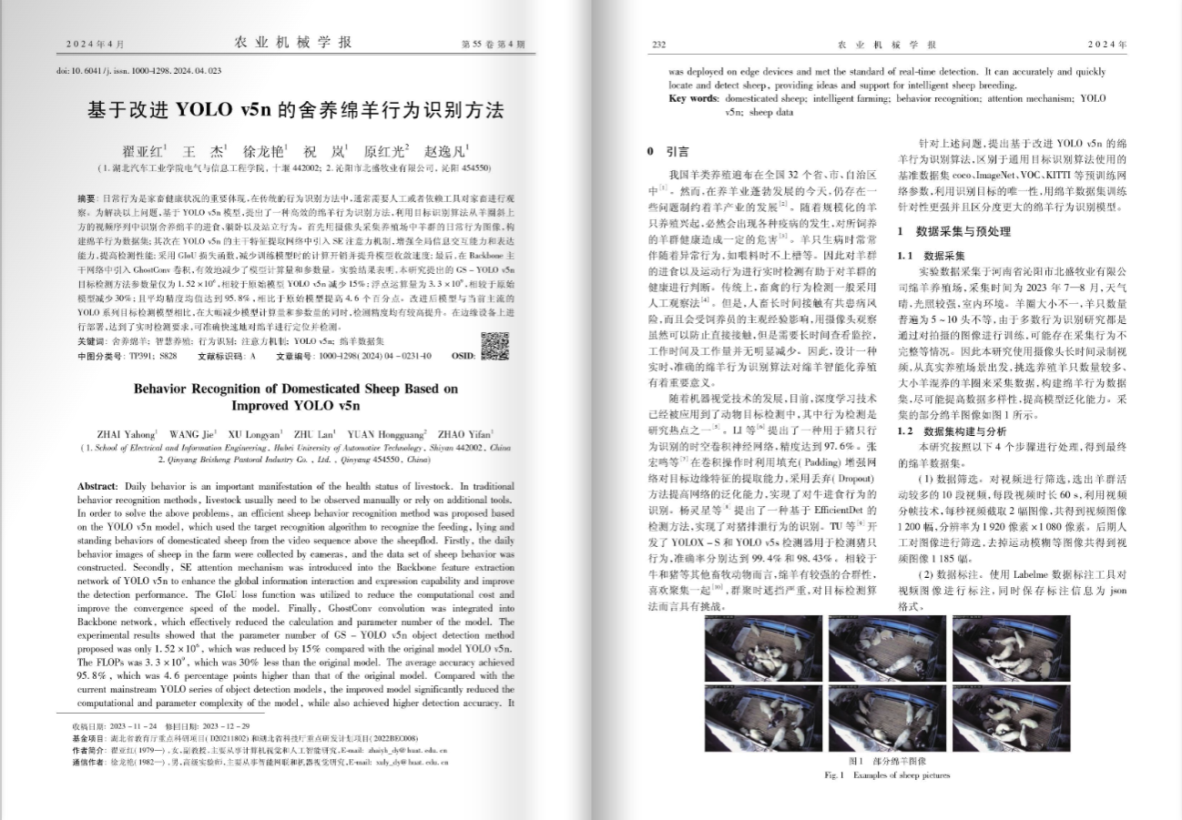 2022年9月,我考入必威西汉姆联官网,成为计算机技术专业的一名硕士研究生,师从必威西汉姆联官网硕士生导师翟亚红教授。入学前,我深知未来的科研之路既充满挑战,更是成长的见证。因此,在研一学年,我便确立要以扎实的课程学习为科研奠基,主动与导师申请提前进入科研生活,在课余时间进行实验,将课堂知识转化为科研实践,最终不仅在期末考试中取得良好的成绩,并在研二上半学年以第二作者的身份(导师为第一作者),在《农业机械学报》期刊上发表题为“基于改进YOLOv5n 的舍养绵羊行为识别方法”的文章。